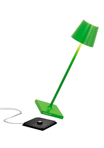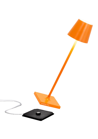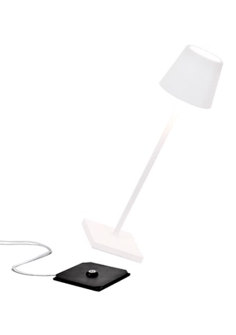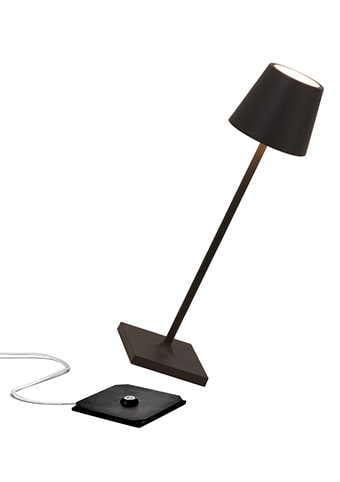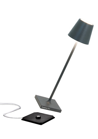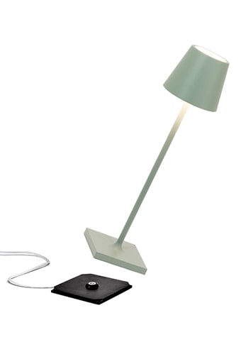 Lampada ricaricabile da tavolo, compresa di base di ricarica a contatto, con corpo in alluminio verniciato, diffusore in policarbonato e fonte luminosa a LED.